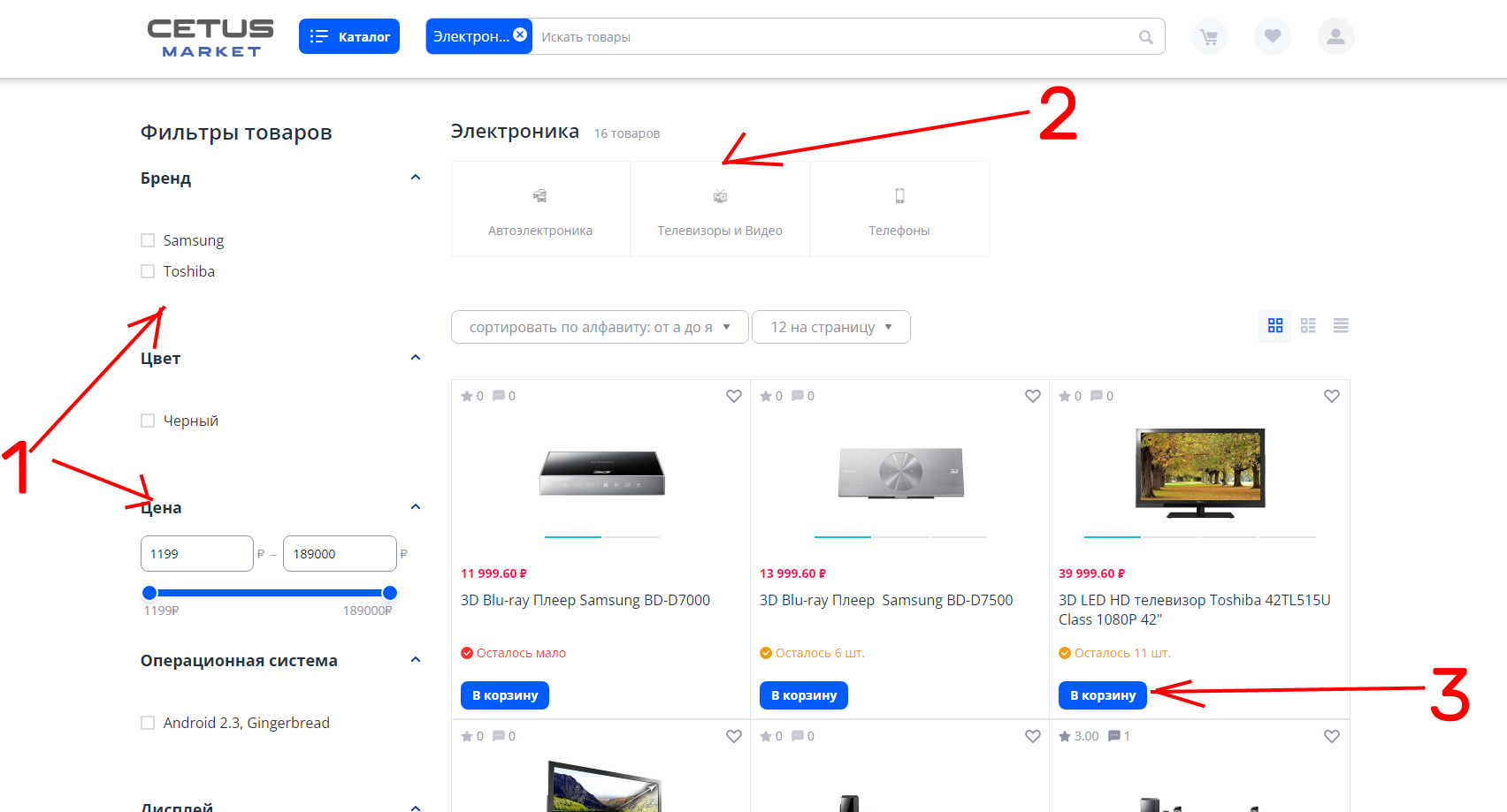 Слева можно задать фильтр по цене, бренду и различным атрибутам товаров.