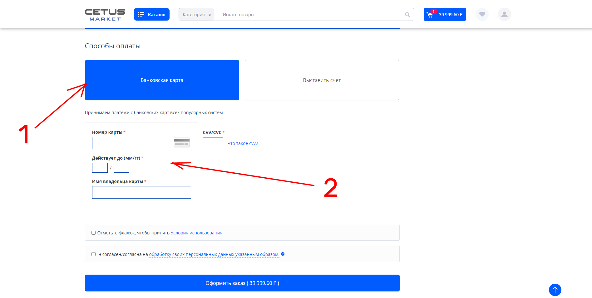 Выберете способ оплаты, введите реквизиты и нажмите на кнопку оплатить заказ.